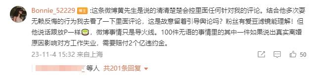 11月3日,黃景瑜前妻王雨馨再度發(fā)文開撕黃景瑜:“你可真是個油膩的極度利己主義”。3日晚間,她再次發(fā)文表示,當(dāng)初自己念舊情妥協(xié)發(fā)了公關(guān)文,但“你調(diào)頭來變臉說承認(rèn)婚姻影響了你的工作”,還指對方故意引導(dǎo)對她不利的輿論。王雨馨稱自己不能說出離婚的真實原因,“如果說出真實離婚原因影響對方工作失業(yè),(她)需要賠付2個億違約金。”