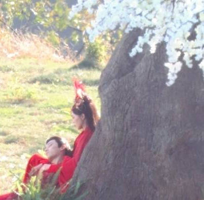 唐嫣抱著劉學(xué)義靠在大樹上。