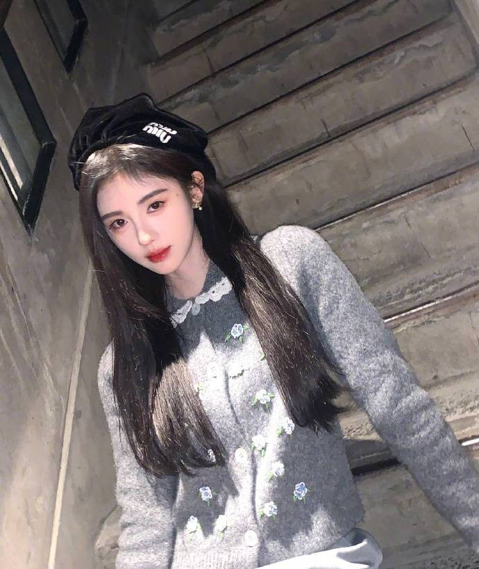 鞠婧祎身穿灰色毛衣搭配黑色貝雷帽。