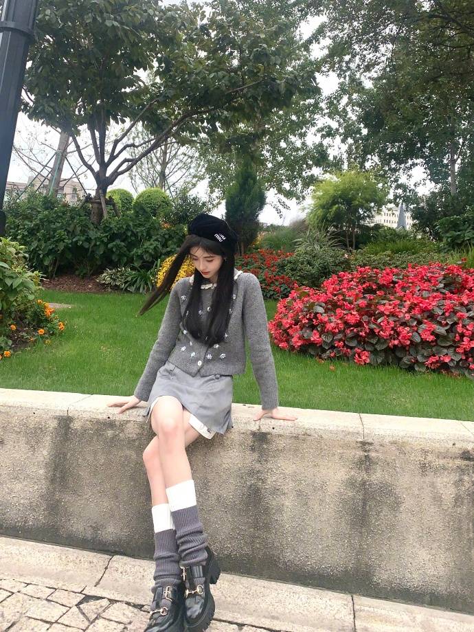 鞠婧祎穿灰色毛衣曬初冬隨拍 游逛花園元?dú)鉂M滿