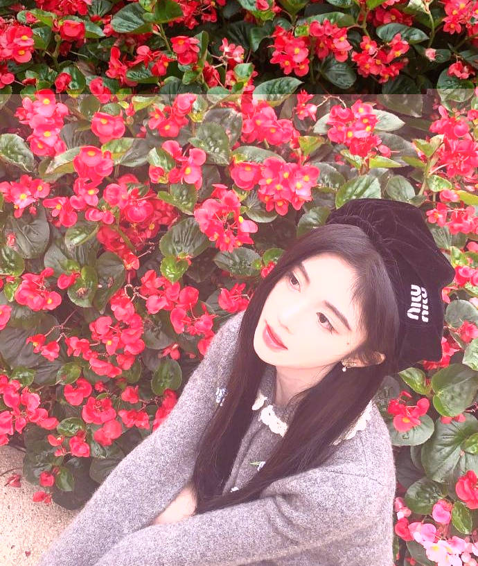 鞠婧祎蹲在地上賞花。