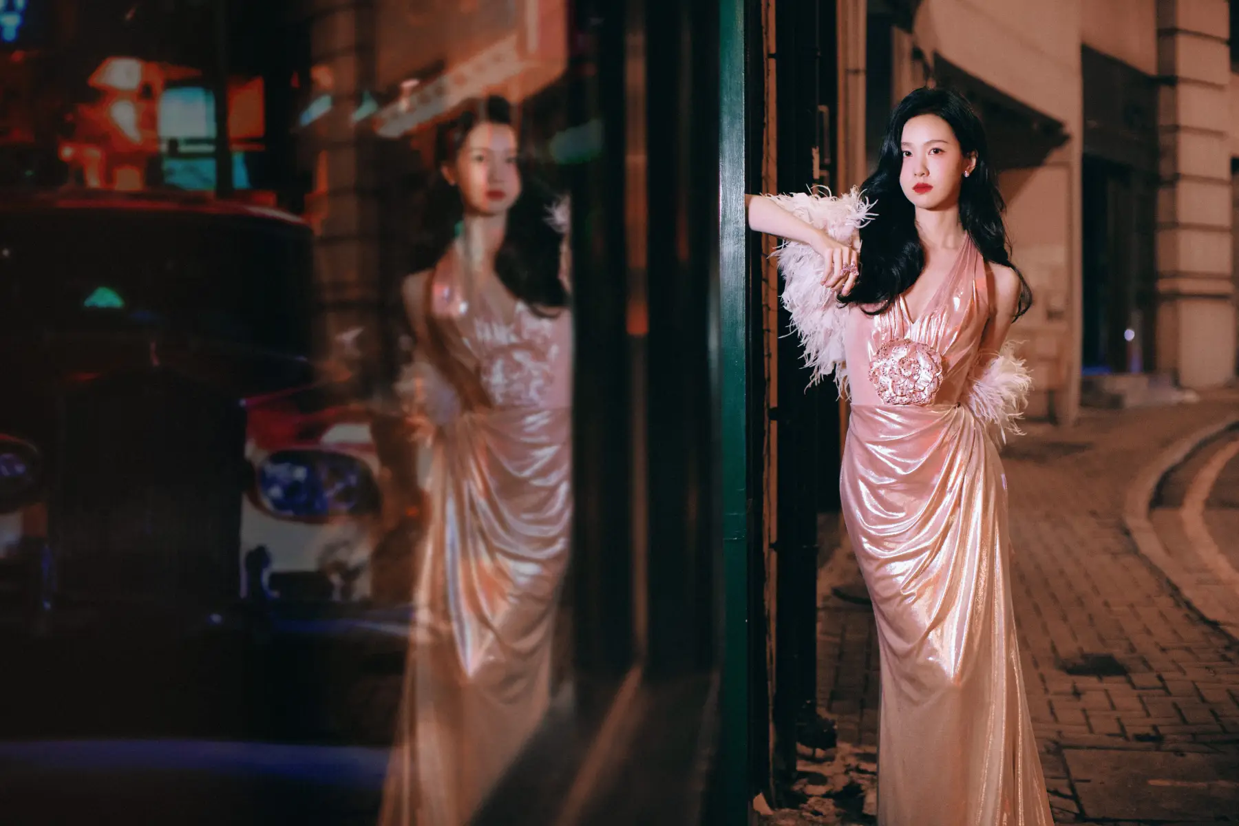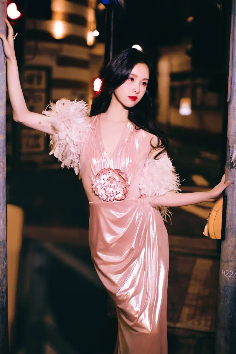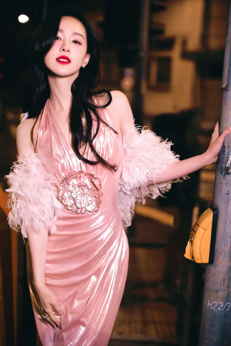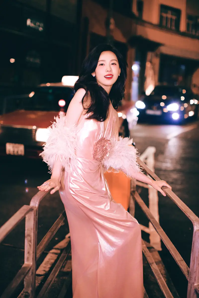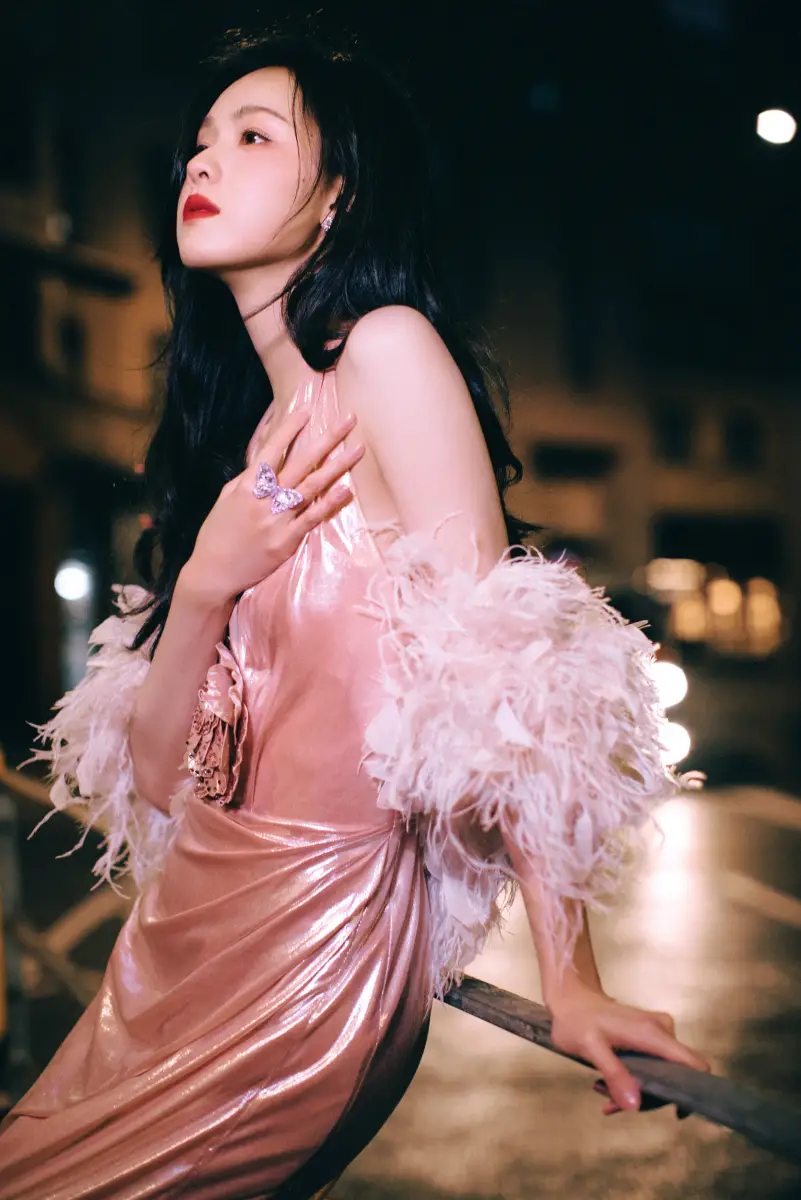 陳都靈一襲粉色羽毛亮片禮服,在香港夜色中顯得尤為動(dòng)人。