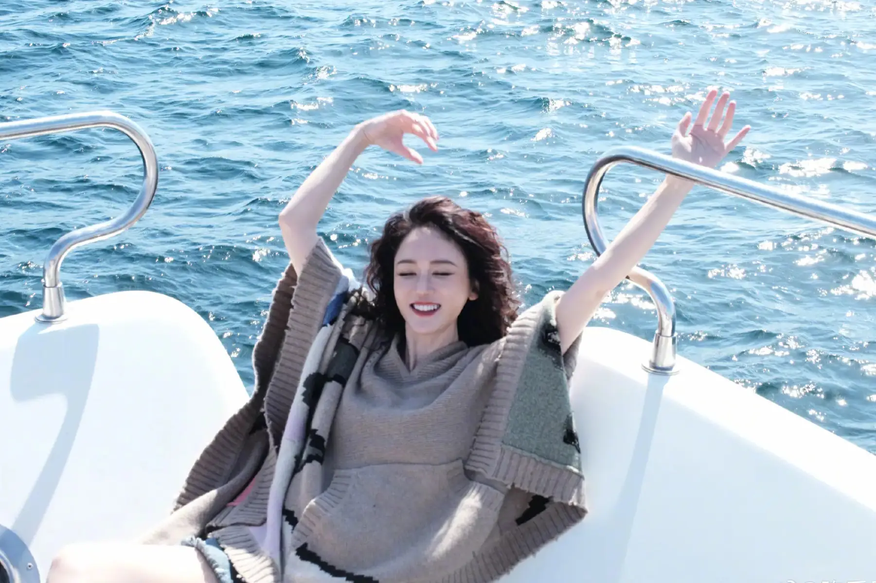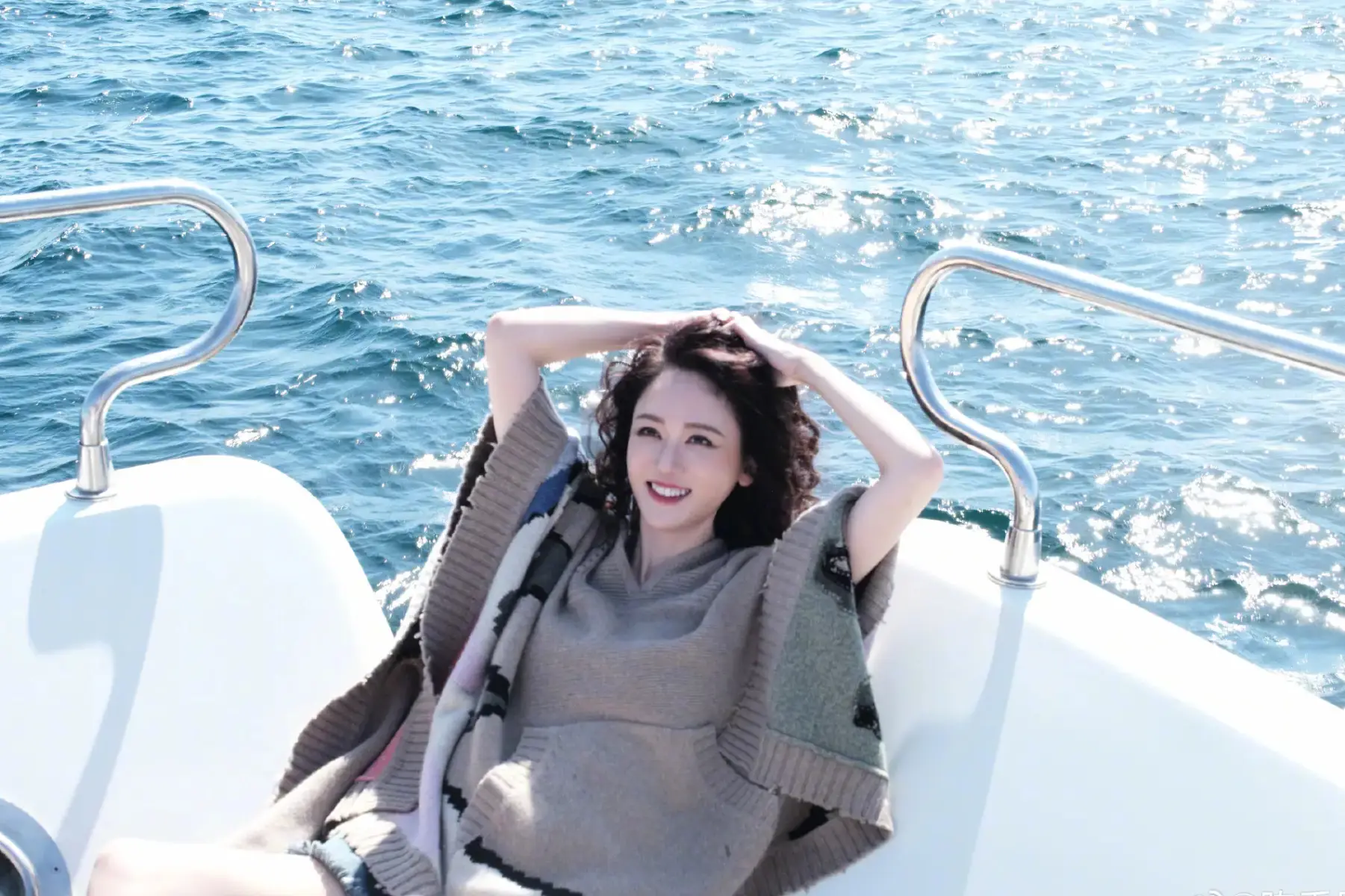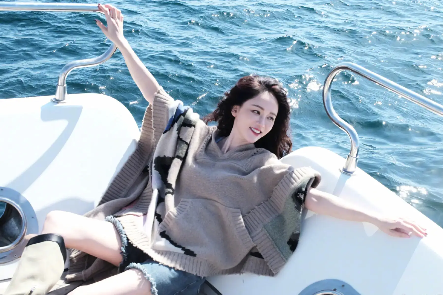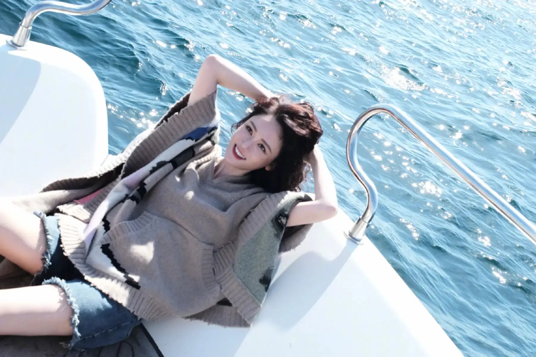 陳喬恩在海上一邊吹風(fēng),一邊曬太陽。