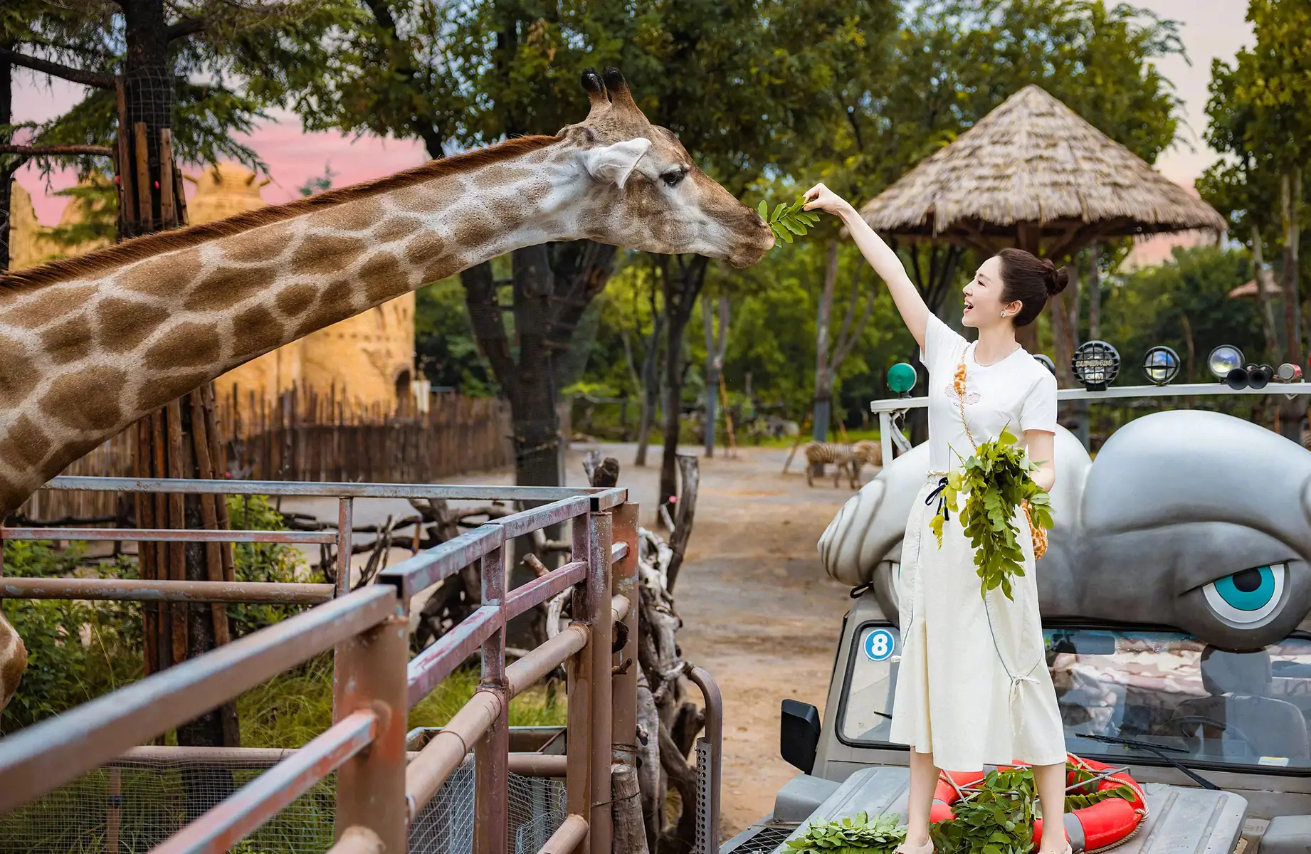 董璇給長頸鹿喂食。