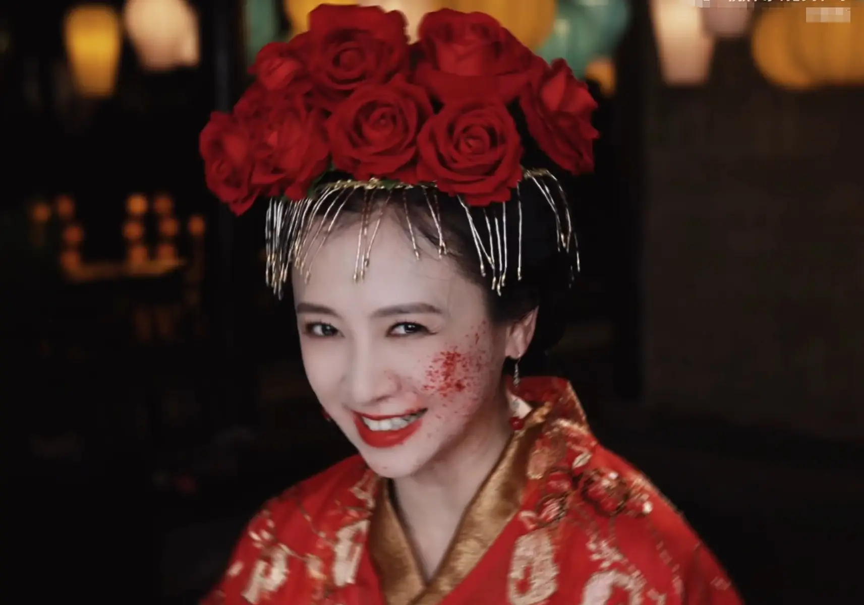 翁虹開懷大笑,搭配臉上的血跡,笑容邪魅,有種鬼新娘的感覺。