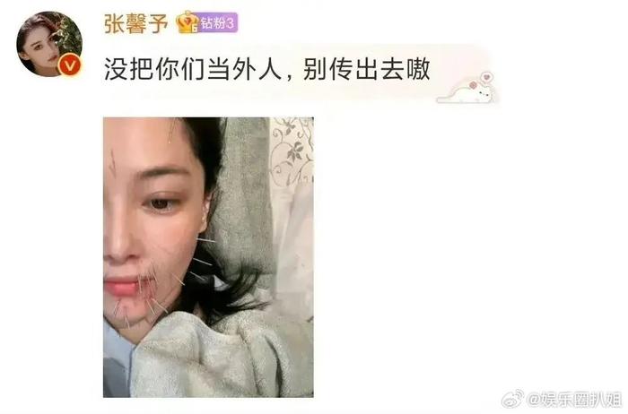 10月30日,張馨予在個人社交賬號上曬出做針灸的自拍照,引發(fā)網(wǎng)友關(guān)注。照片中張馨予躺在床上,曬出半張臉,他的臉上插滿了治療用的針,看起來像是刺猬一樣。