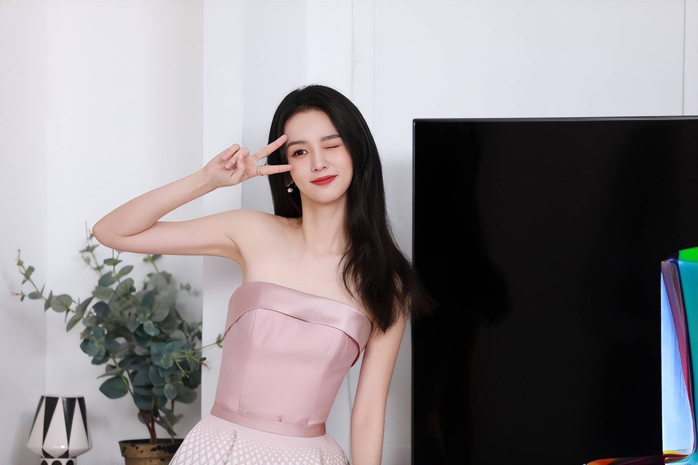 周也穿粉色抹胸裙大秀香肩!雪膚玉貌青春玉女美爆了