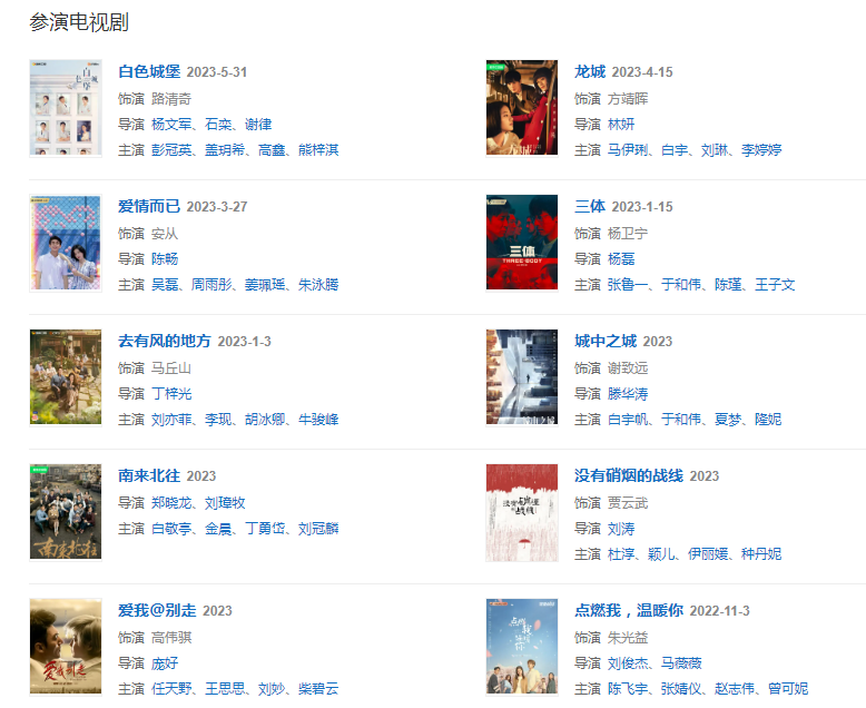 2021年6月28日,參演的電視劇《我和我們在一起》播出;7月8日,主演的電視劇《衡山醫(yī)院》開播;7月26日,參演的電視劇《你是我的榮耀》開播 ;10月21日,參演的電視劇《突圍》播出;11月16日,與陳建斌、梅婷主演的電視劇《不惑之旅》播出;12月11日,主演的家庭倫理劇《小敏家》在湖南衛(wèi)視播出。