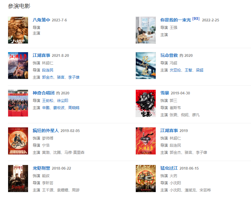 2015年參演賀歲電影《老炮兒》。2016年參加北京衛(wèi)視跨界喜劇競技秀《跨界喜劇王》 [8] ,9月23日領(lǐng)銜主演的喜劇電影《三個孬家伙》上映。