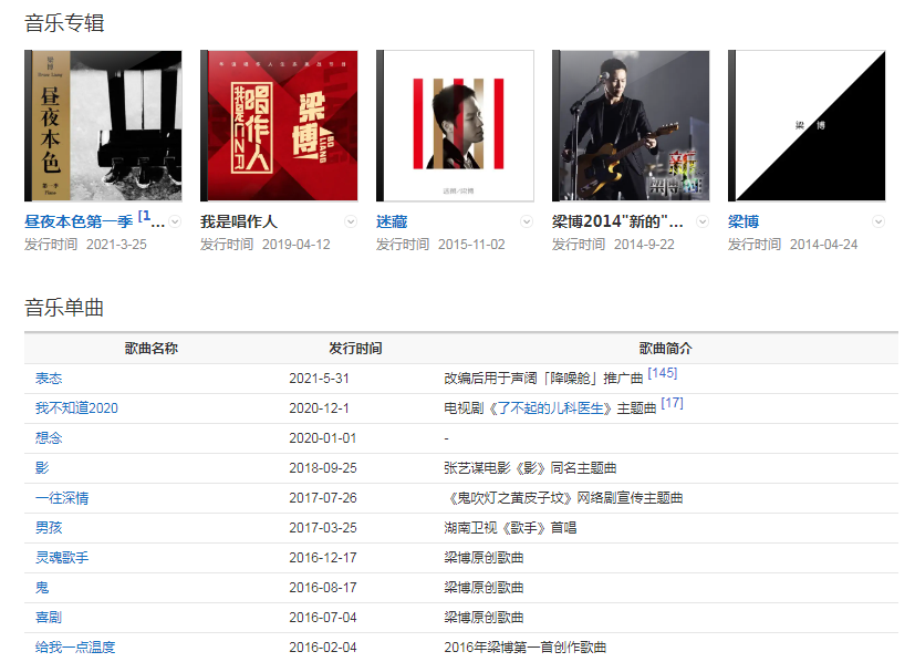 2012年,參加浙江衛(wèi)視勵志專業(yè)音樂評論節(jié)目《中國好聲音第一季》,獲得年度總冠軍;12月29日,憑借原創(chuàng)歌曲《因為》獲得第20屆中國歌曲排行榜“年度最受歡迎新人”獎。2014年,發(fā)行首張創(chuàng)作專輯《梁博》;5月23日、24日連開兩場梁博2014《新的》演唱會;8月16日,獲邀亮相亞洲頂級音樂節(jié)Summer Sonic,亞洲舞臺壓軸表演。