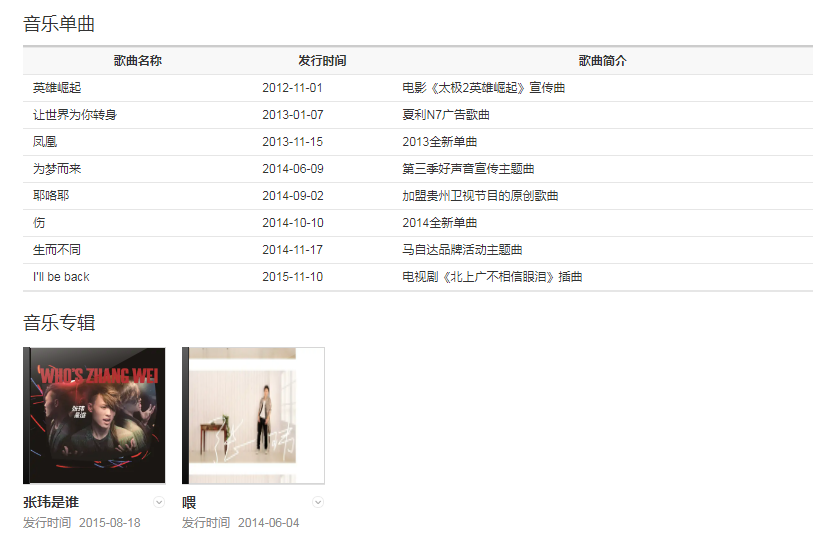 2015年4月三度參加全球華語榜中榜,憑借單曲《生而不同》摘得“Channel V年度最佳金曲獎(jiǎng)”;5月傾情代言西山居《西游降魔篇·動(dòng)作版》手游;6月微博同名專輯《張瑋是誰》主打歌《遺世獨(dú)立》正式上線;7月獻(xiàn)聲由周杰倫擔(dān)當(dāng)導(dǎo)演的第四季中國(guó)好聲音宣傳片;8月發(fā)行2015全新大碟《張瑋是誰》。