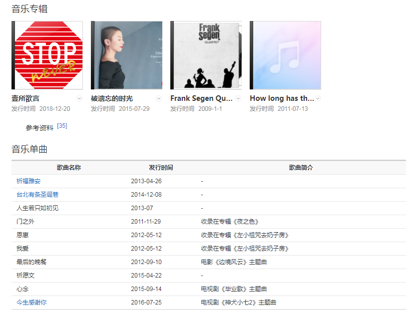 代表作品:臺北有條圣誕巷、人生若只如初見、大片、中國好聲音第一季、一切無關(guān)緊要的遇見