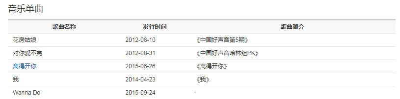 2015年9月25推出單曲《Wanna Do》;獻(xiàn)唱《星語(yǔ)心愿之再愛》主題曲《星語(yǔ)心愿》 [10] 。10月,推出歌曲《離得開你》。11月推出首張專輯《一個(gè)人的歌》。主打歌曲MV《一個(gè)人的歌》于11月11日“光棍節(jié)”上線。