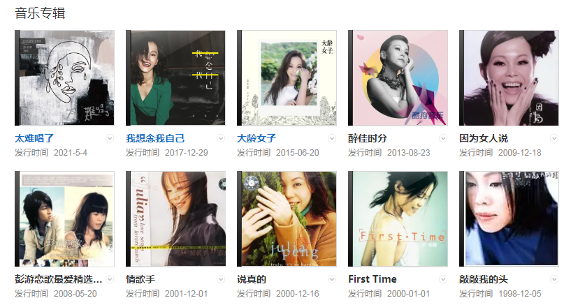 代表作品:相見恨晚、舊夢、大齡女子、回味、我想念我自己、走在紅毯那一天、喜歡兩個人、敲敲我的頭、太難唱了