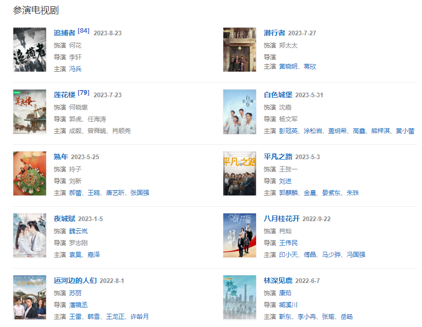 代表作品:小留學生、愛了散了、我的兒子是奇葩、產科醫(yī)生、大好時光、羋月傳、遙遠的距離、燕陽春、金色索瑪花