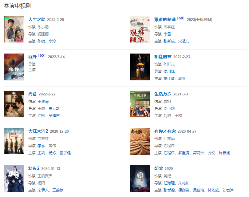 此后于2019年和2020年與正午陽光接連合作了《大江大河2》及《相逢時節(jié)》,在《相逢時節(jié)》中飾演男主角雷佳音的妻子陳昕兒一角。
