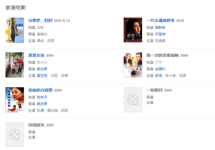 代表作品:正陽(yáng)門(mén)下小女人、一代女魂唐群英、浪漫女孩、美麗的白銀那、雷雨、黑冰、女人不哭、金枝玉葉