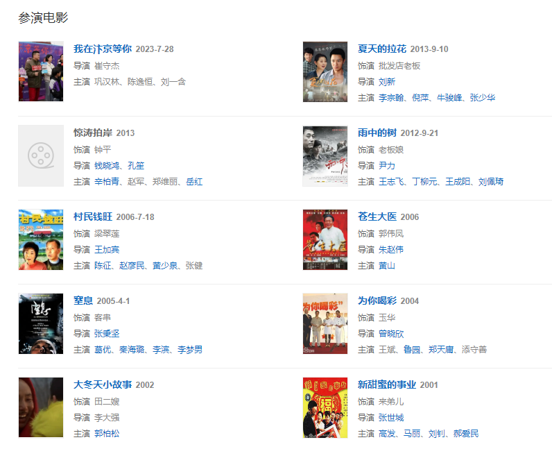 代表作品:當家的女人、闖關(guān)東2、胡楊女人、小麥進城、黨的女兒、女人的村莊、我在北京·挺好的、小草青青、關(guān)中女人