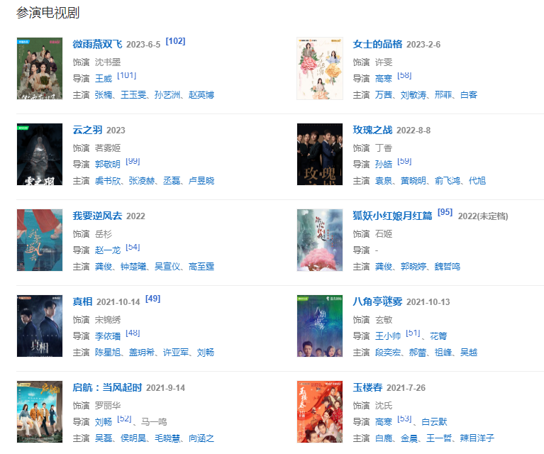2021年3月17日,參演的電視劇《若你安好便是晴天》開播,飾演陸丹;9月14日,參演電視劇《啟航:當風起時》播出 ;10月14日,主演的懸疑網劇《真相》在優(yōu)酷播出;參演電視劇《鐵道風云》;參演電視劇《八角亭謎霧》。12月7日,出演的都市職場精品劇《我要逆風去》在上海開機;參演電視劇《號手就位》。主要作品(部分)