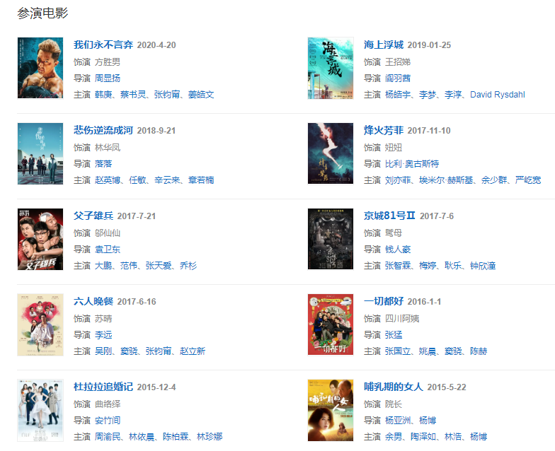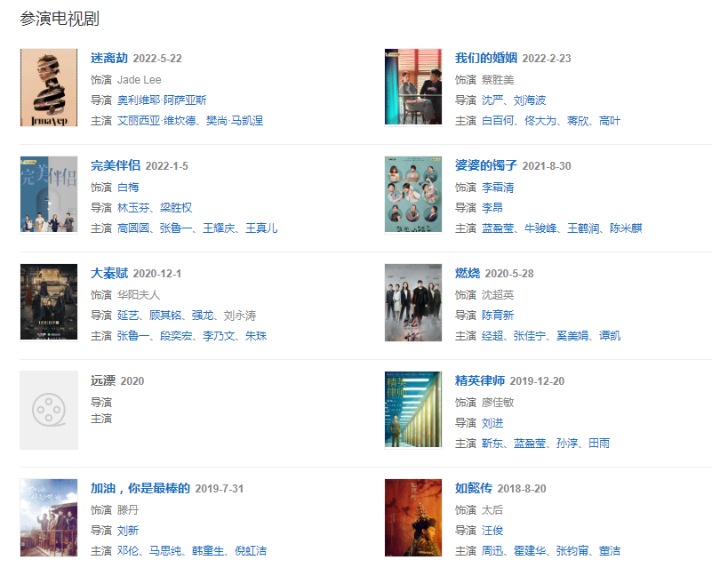 代表作品:蝸居、枕邊書(shū)、末代皇帝、宋家皇朝、玫瑰漩渦、辣媽正傳、六人晚餐、上海紅美麗、如懿傳、加油,你是最棒的、精英律師、建國(guó)大業(yè)