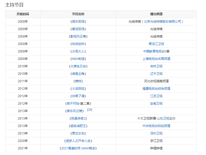 2008年起擔(dān)任光線傳媒旗下主打節(jié)目《娛樂現(xiàn)場》《最佳現(xiàn)場》《影視風(fēng)云榜》的主持,同時也是黑龍江衛(wèi)視周末黃金強檔主打綜藝娛樂節(jié)目《快活武林》的女主持。