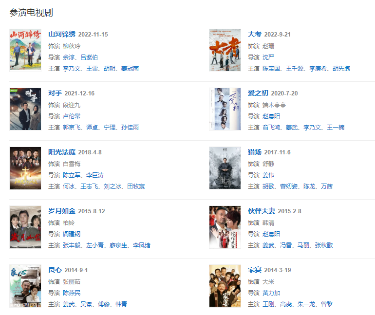 代表作品:借槍、滿秋、愛之初、萬箭穿心、紅十字方隊、愛情的牙齒、女人一輩子、盛先生的花兒、追捕野狼幫