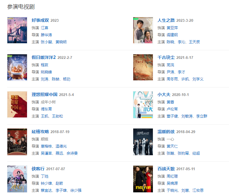 代表作品:又見一簾幽夢、延禧攻略、絲絲心動(dòng)、千古玦塵、微笑在我心、城市戀人、新俠客行、小大夫、溫暖的弦