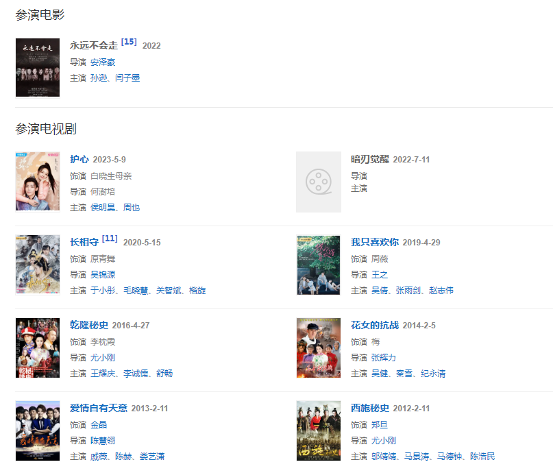 2013年,出演都市劇《愛情自有天意》;同年,出演清裝劇《乾隆秘史》。