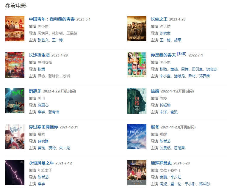 2022年1月,在文化類(lèi)綜藝節(jié)目《朗讀者第三季》中朗讀《小敘事》;同年,參加《百花迎春》晚會(huì),與靳東、吳京等人共同講述《致百花》。同年,與劉昊然、屈楚蕭主演的電影《燃冬》 ;3月17日,為電影《你是我的春天》獻(xiàn)唱的主題曲《想看你笑的樣子》發(fā)布;同年,主演由陳道明擔(dān)任總策劃、黃渤擔(dān)任監(jiān)制的抗疫電影《你是我的春天》;4月,參演的電影《熱搜》殺青。4月22日,與章宇、張宥浩領(lǐng)銜主演的電影《鸚鵡殺》宣布開(kāi)機(jī)。2022年,周冬雨參演獻(xiàn)禮“二十大”影片《中國(guó)青年:我和我的青春》(暫定名);5月23日,參加紀(jì)念毛澤東同志《在延安文藝座談會(huì)上的講話》發(fā)表八十周年暨慶祝大眾電影百花獎(jiǎng)創(chuàng)立六十周年特別節(jié)目。