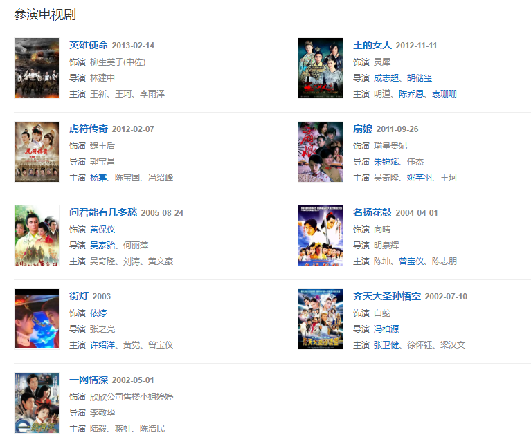 2005年,在古裝題材愛情劇《問君能有幾多愁》中飾演黃保儀。